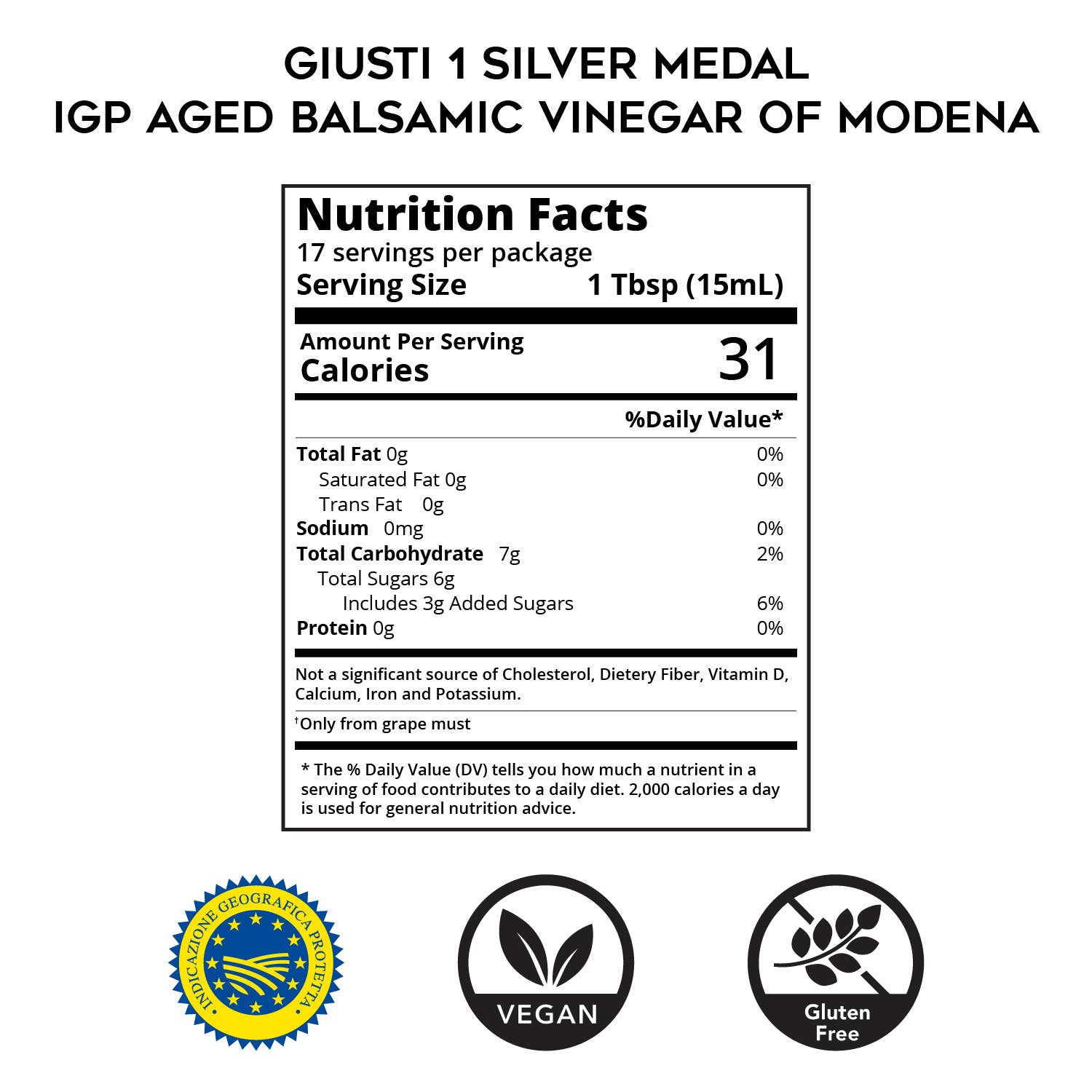Giusti - 1 Silver Medal Italian Balsamic Vinegar of Modena MODENA BALSAMIC VINEGAR – Crafted in Modena using the finest must of cooked grapes and wine vinegar, this balsamic is refined in oak barrels with the addition of traditional balsamic vinegar from centuries-old casks.